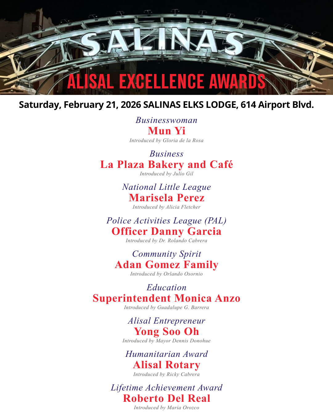 Join us for the Alisal Excellence Awards set to take place on Friday, February 21 at the Salinas Elks Lodge.