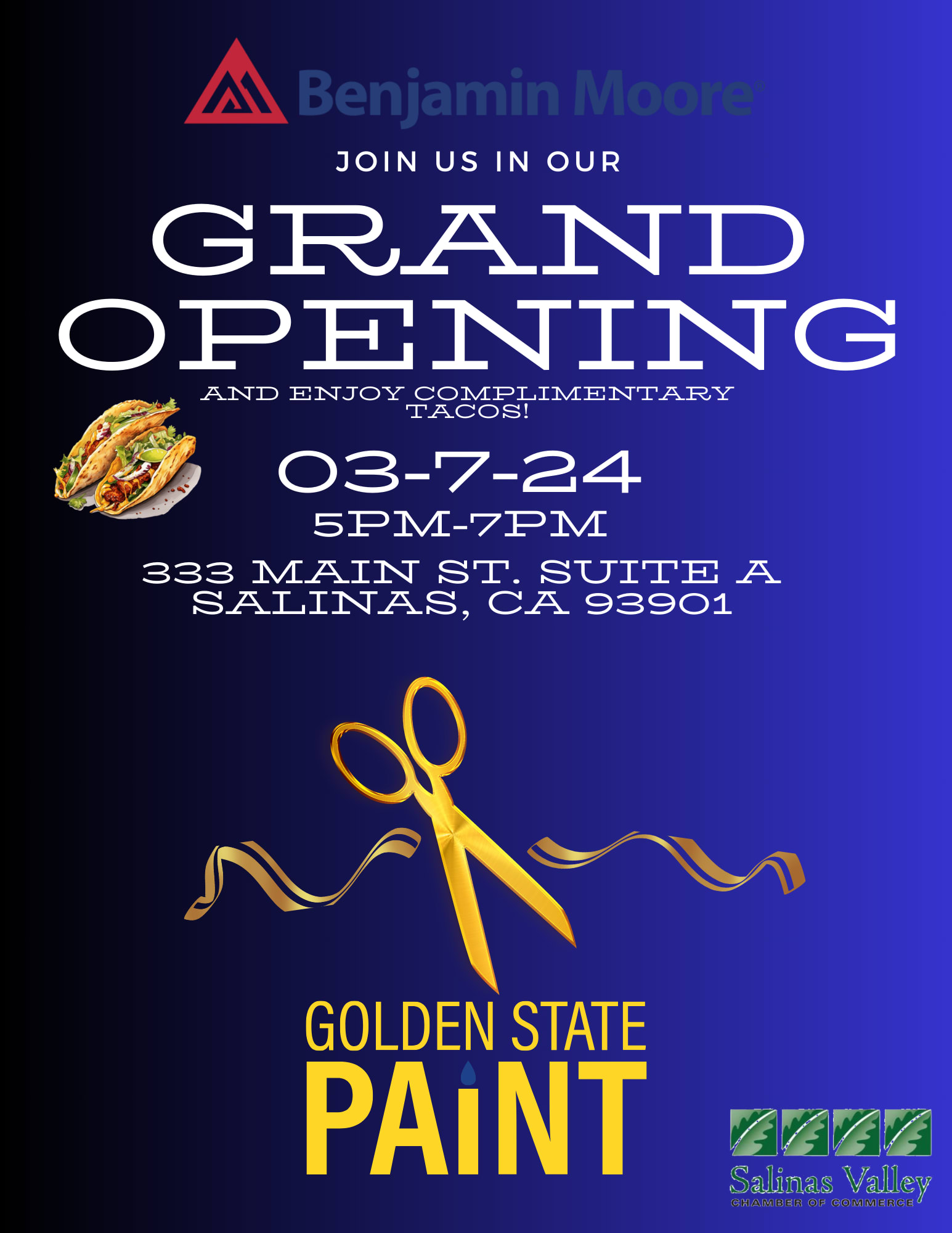 Join us in celebrating the grand opening of Golden State Paint Company! As the newest independently owned Benjamin Moore retailer in your neighborhood, we're thrilled to embark on this exciting journey of serving our community with top-quality paints and expert advice. Be among the first to explore our store's unique ambiance and discover the extensive range of Benjamin Moore paints. Come celebrate with us as we eagerly open the doors to our new store. We can't wait to welcome you and share the joy of color with our community. Your presence will make this truly special. See you there!Images