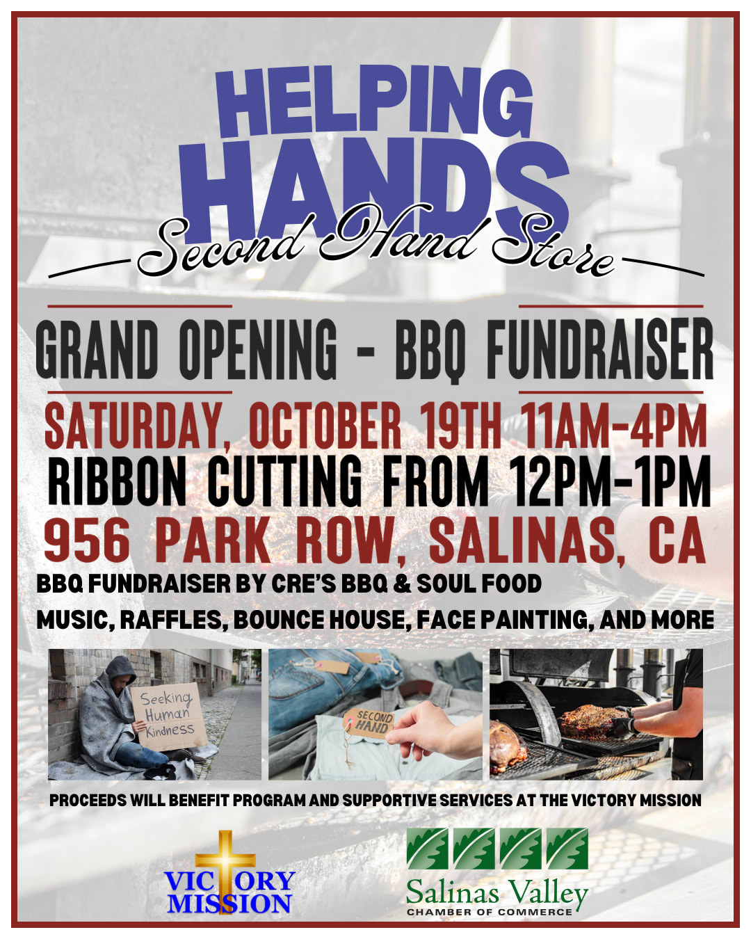 Join us for the Grand Opening and BBQ Fundraiser for Helping Hands Second-Hand Store taking place on Saturday, October 19 at 956 Park Row, Salinas, CA, 93901. The ribbon cutting takes place from 12:00 PM - 1:00 PM. The fundraiser and BBQ event is from 11:00-4:00 PM.