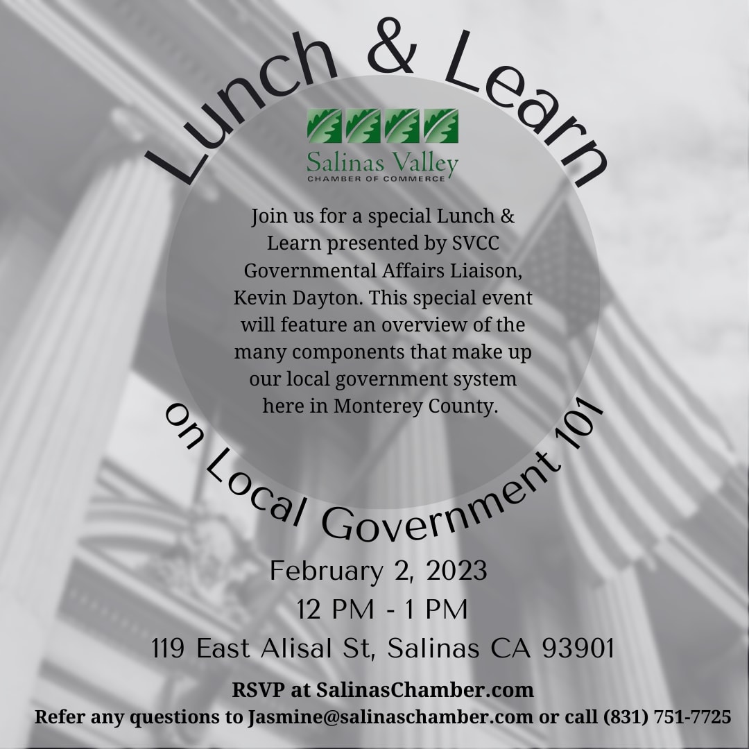 This special event will feature an overview of the many components that make up our local government system here in Monterey County. The session will highlight key areas of importance impacting the local business community.