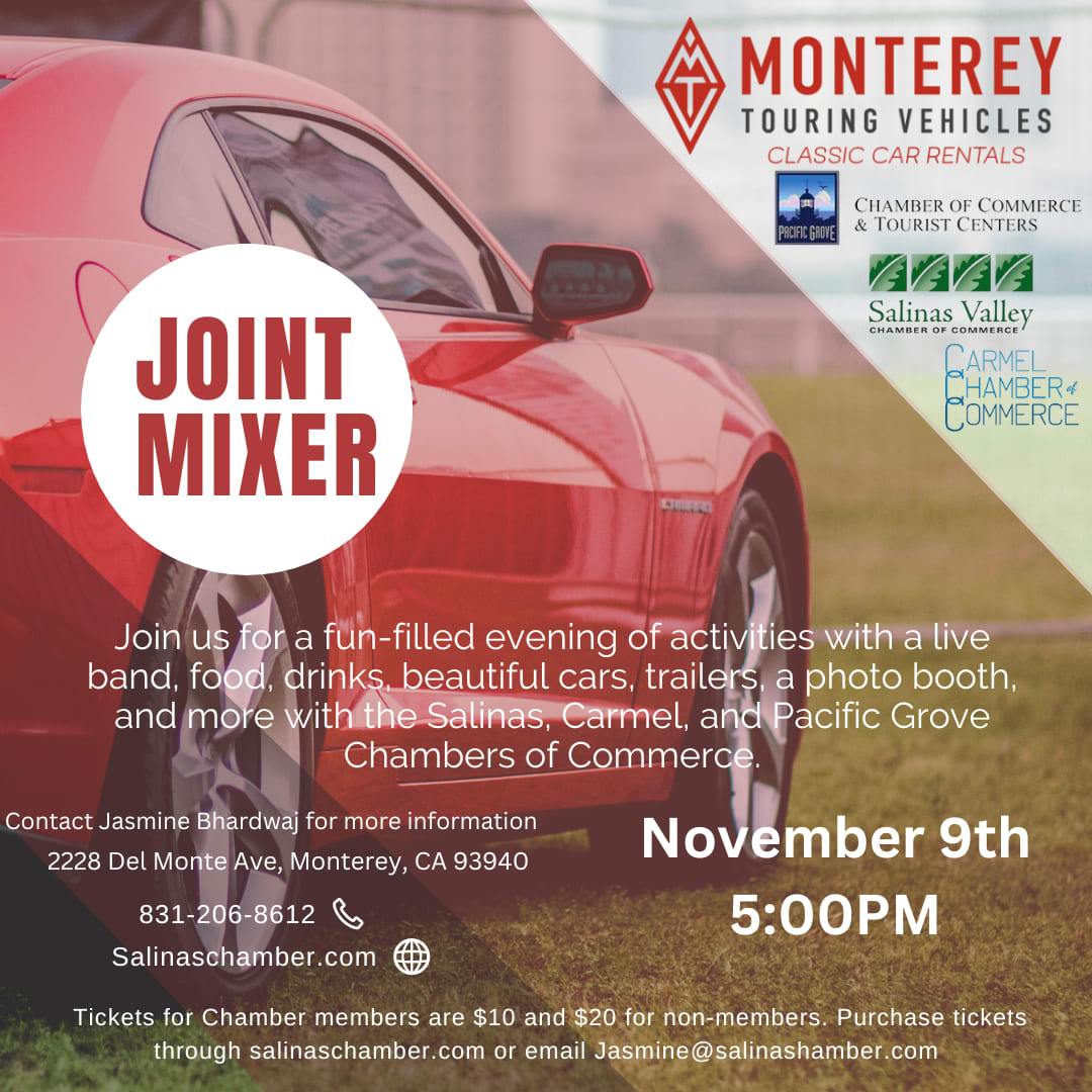 Join us for a fun-filled evening of activities with a live band, food, drinks, beautiful cars, trailers, a photo booth, and more with the Salinas, Carmel, and Pacific Grove Chambers of Commerce. Tickets for Chamber members are $10 and $20 for non-members. Purchase tickets through Salinaschamber.com.Images