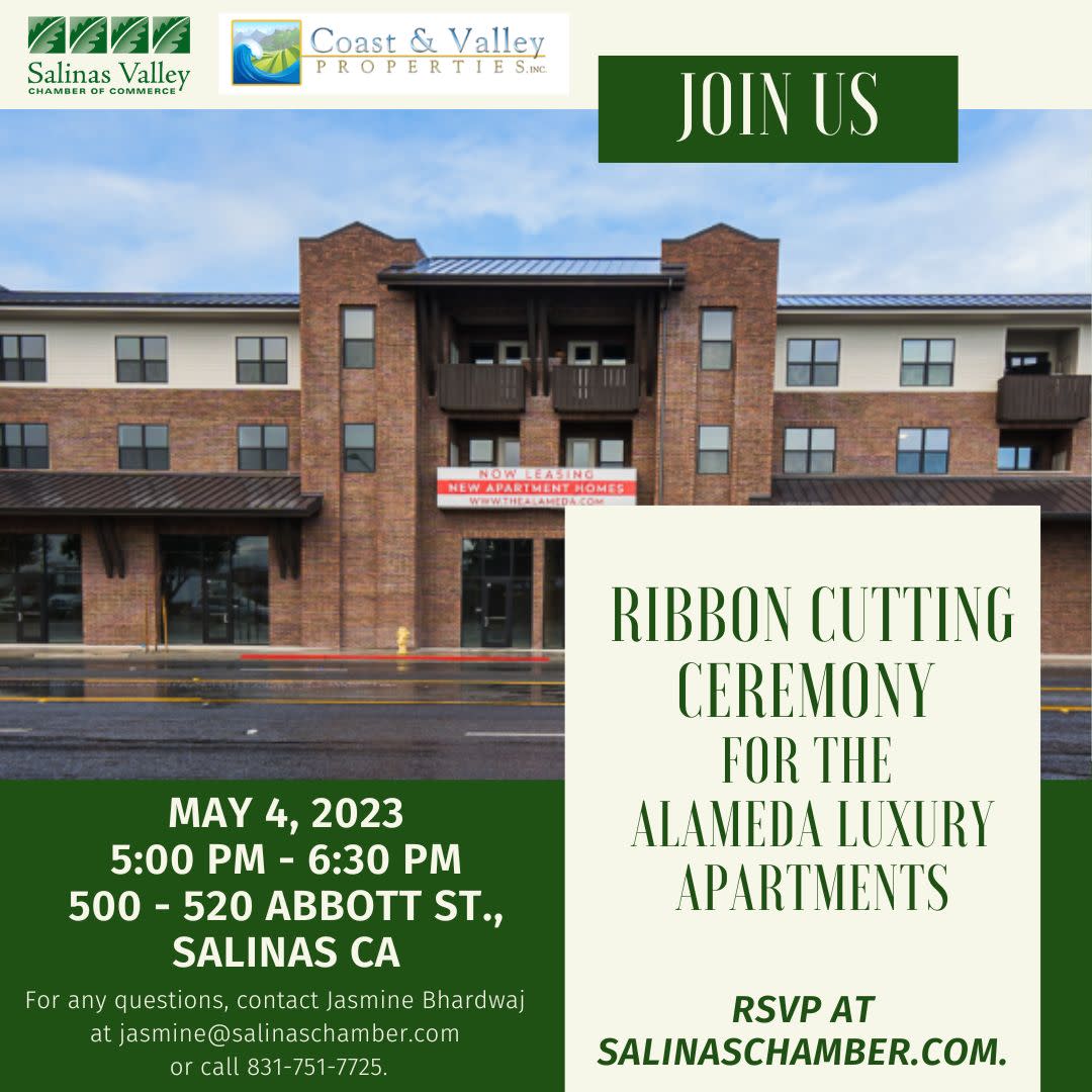 You are invited to join us for a ribbon cutting with Coast and Valley Properties in honoring the Harrod Family for the new Alameda Luxury Apartments that are now open in Salinas. Come celebrate the opening, enjoy hors d’oeuvres, network, and have a great time!