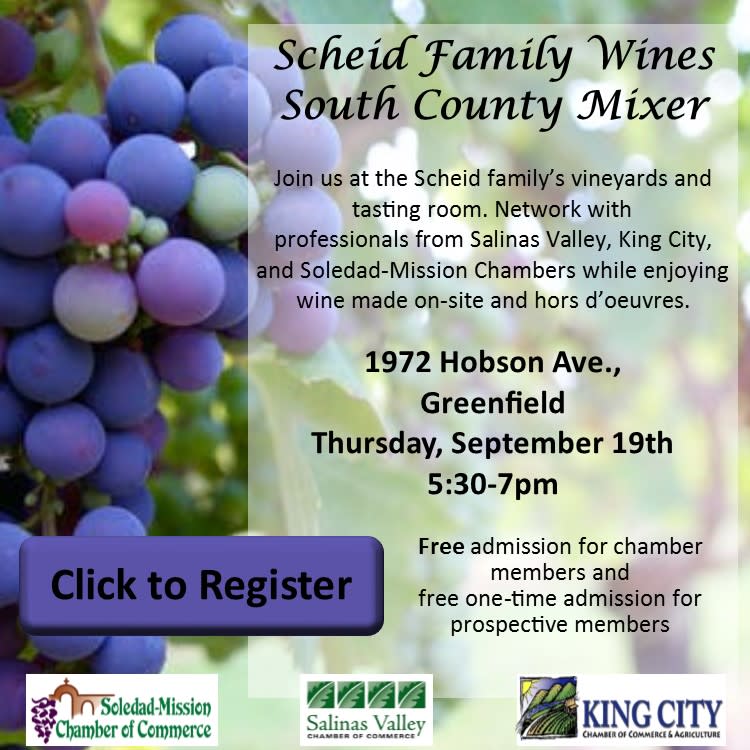 Enjoy wine and hors d'oeuvres at Scheid Vineyards Winery & Tasting Room in Greenfield. Mix and mingle with business owners and professionals from Salinas Valley, King City, and Soledad-Mission Chambers.