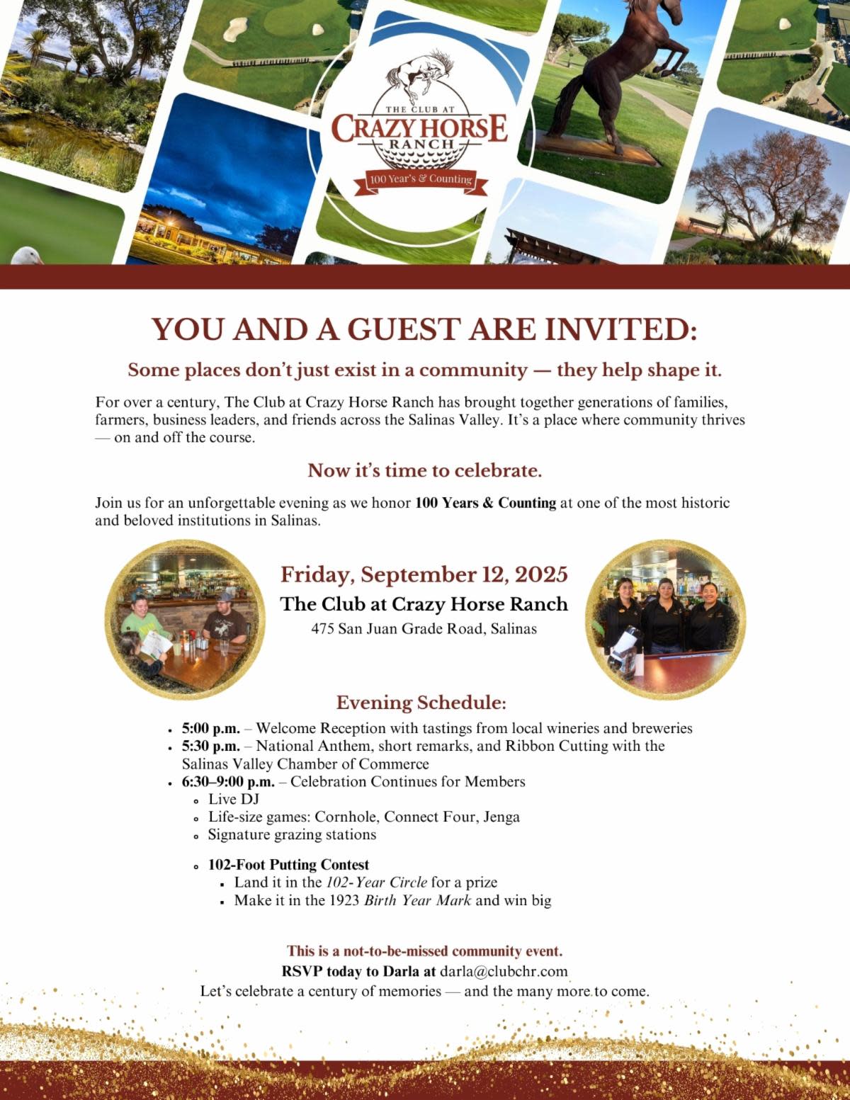 For over a century, The Club at Crazy Horse Ranch has brought together families, farmers, business leaders, and friends across the Salinas Valley. Now, it’s time to celebrate the history we’ve built—and the future we’re creating.