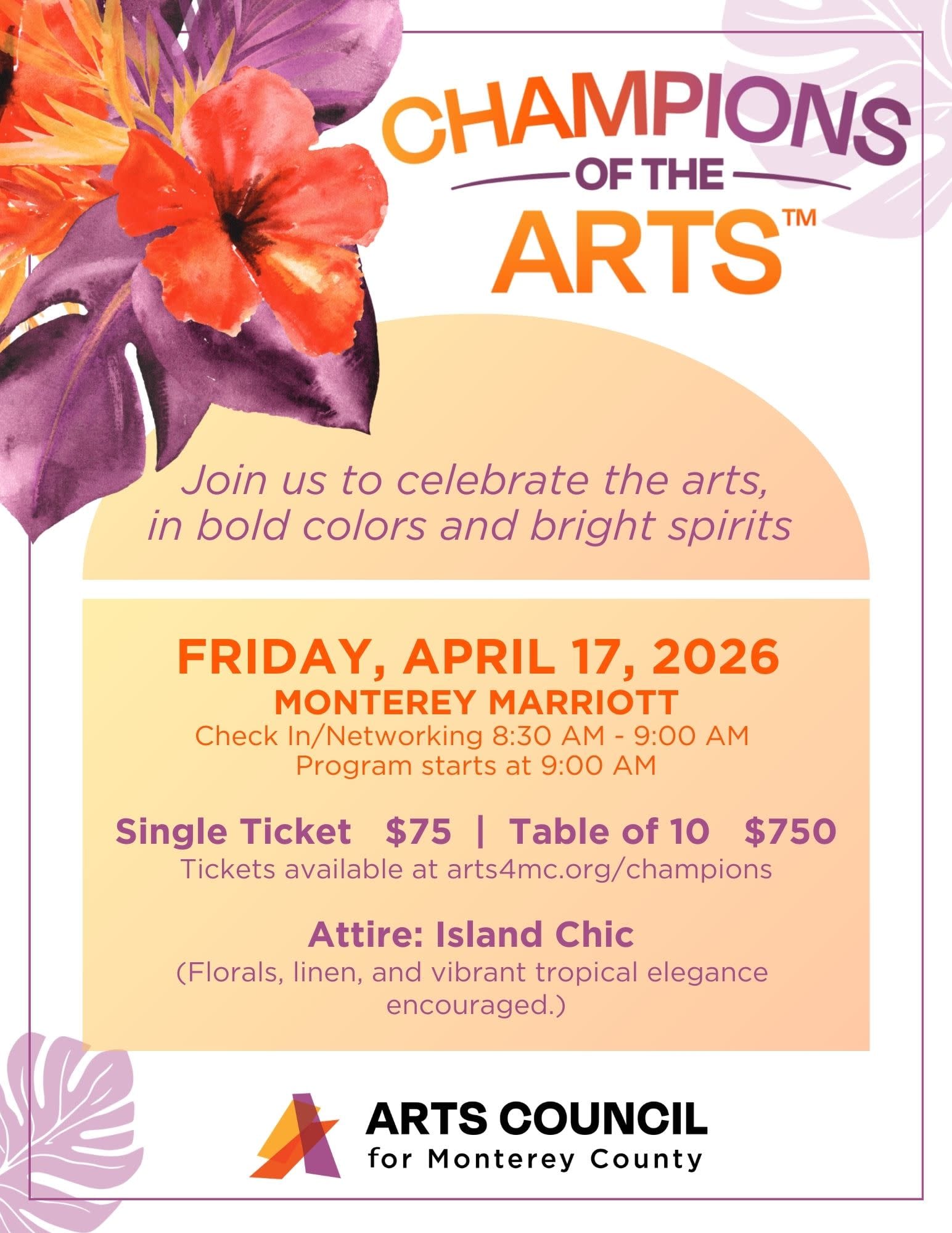 Champions of the Arts™ presented by Arts4MC, is a highly regarded award that honors individuals, organizations, and businesses making a profound impact on the arts in Monterey County. Nominated by the community, this recognition celebrates those who inspire creativity, promote cultural engagement, and advocate for the transformative role of the arts in enriching lives. This award highlights the extraordinary contributions that drive artistic expression and strengthen community connections. Join us for one of kind celebration! Single Ticket $75 | Table of 10 $750Images