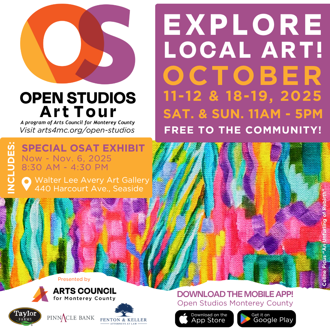 Enjoy the free, self-guided Monterey County Open Studios Art Tour on October 11-12 & 18-19 (11 AM - 5 PM). Visit artist studios, see demos, and find original art. Plus, enjoy the Special Exhibition at the Avery Gallery open now through November 6th. Get the app or visit arts4mc.org/open-studios