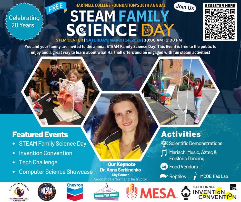 Salinas, Calif. – The Hartnell College Foundation and the K-12 STEAM Programs proudly present the 20th Annual STEAM Family Science Day on Saturday, March 14, 2026, from 10 a.m. to 2:00 p.m. at Hartnell College, 411 Central Avenue in Salinas.