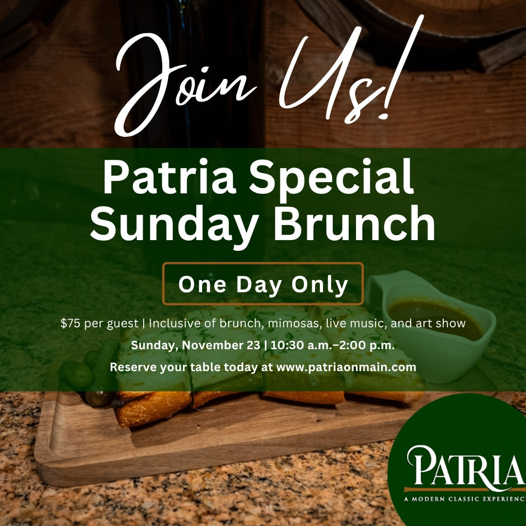 Salinas, CA – Patria, one of Oldtown Salinas’ most celebrated restaurants, will host a special one-time Sunday Brunch event on Sunday, November 23, from 10:30 a.m. to 2:00 p.m. Guests will enjoy unlimited mimosas, a chef-inspired menu, live entertainment, and an exclusive art exhibition, all for $75 per guest (all-inclusive).